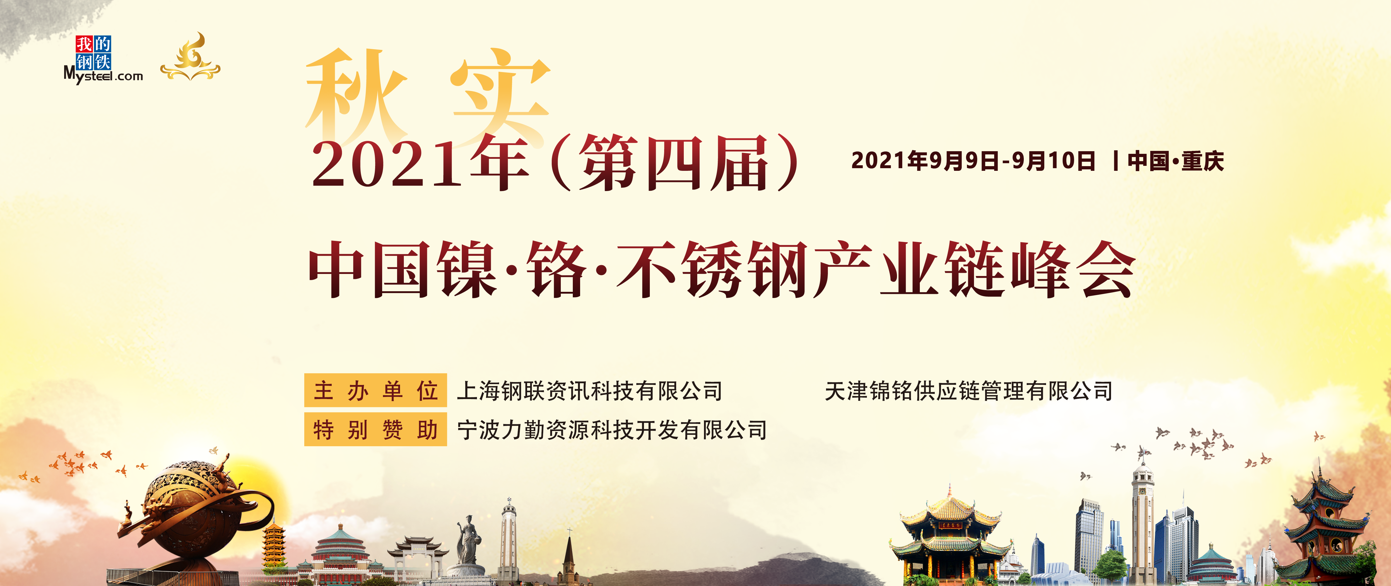 2021年9月9日-9月10日,由上海鋼聯資訊科技有限公司(Mysteel我的不銹鋼網)攜手天津錦銘供應鏈管理有限公司聯合主辦,寧波力勤資源科技開發有限公司特別贊助的“「秋實」2021年(第四屆)中國鎳·鉻·不銹鋼產業鏈峰會”,于重慶喜來登大酒店盛大開幕。