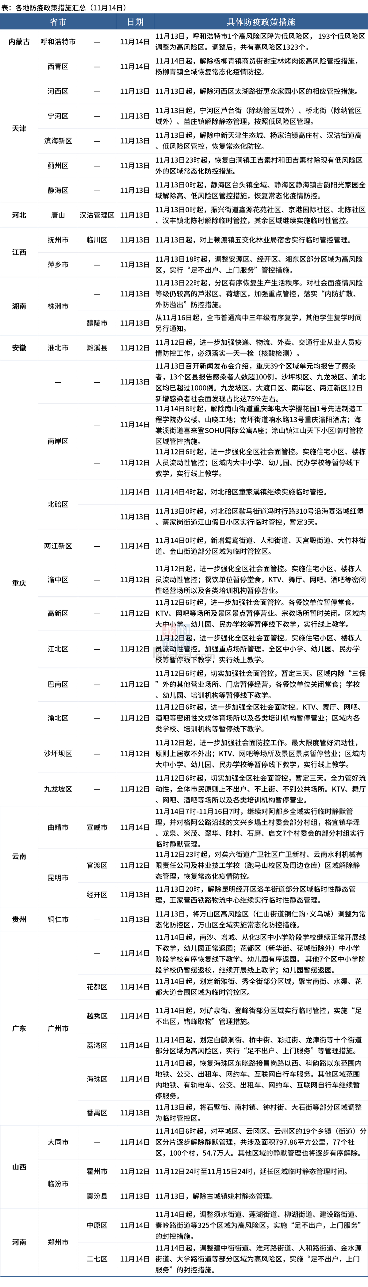 其中,河北唐山市漢沽管理區11月13日0時起解除振興街道鑫源花苑社區、京港國際社區、北陳社區、漢豐鎮北陳村臨時管控,其余區域繼續實施臨時性管控。廣東廣州市11月14日起,南沙、增城、從化3區中小學階段學校繼續正常開展線下教學,幼兒園正常返園;花都區(新華街、花城街除外)中小學階段學校有序恢復線下教學、幼兒園有序返園。 其他7個區中小學階段學校仍暫緩返校,繼續開展線上教學;幼兒園暫緩返園。山西大同市11月14日6時起,對平城區、云岡區、云州區的19個鄉鎮(街道)分區分片逐步解除靜默管理,共涉及面積797.86平方公里,77個社區,100個村,54.7萬人。其他區域的靜默管理也將逐步有序解除。